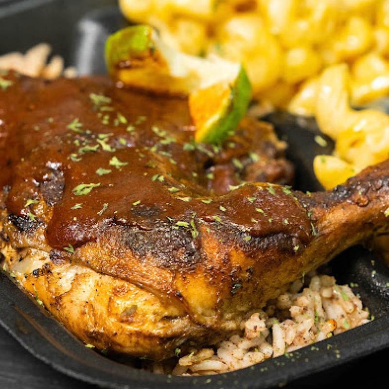 Juicy, spicy jerk chicken marinated in authentic Caribbean spices and grilled to perfection. Served with rice and 2 sides.