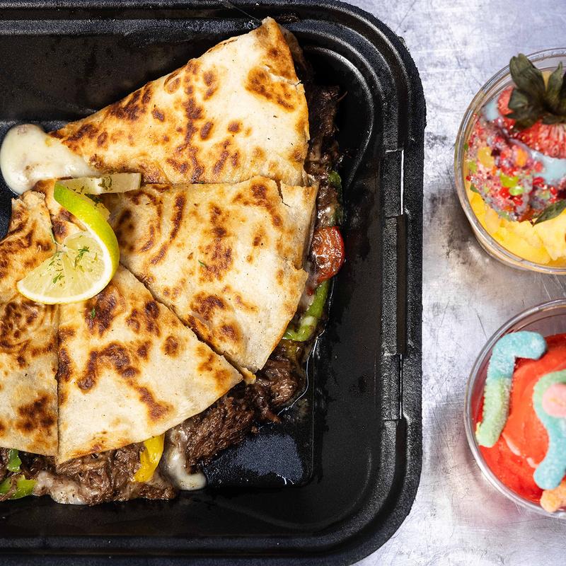 Soft quesadilla filled with tender slow-cooked oxtails, cheddar cheese, fresh