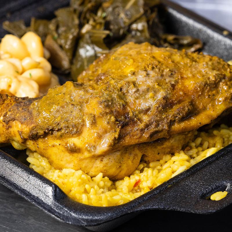Juicy, spicy curry chicken marinated in authentic Caribbean spices and grilled to perfection. Served with rice and 2 sides.