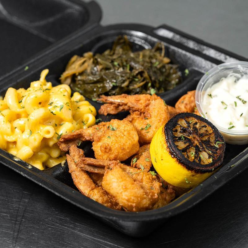 A generous serving of succulent shrimp, breaded and fried, served with tangy cocktail sauce and 2 sides.