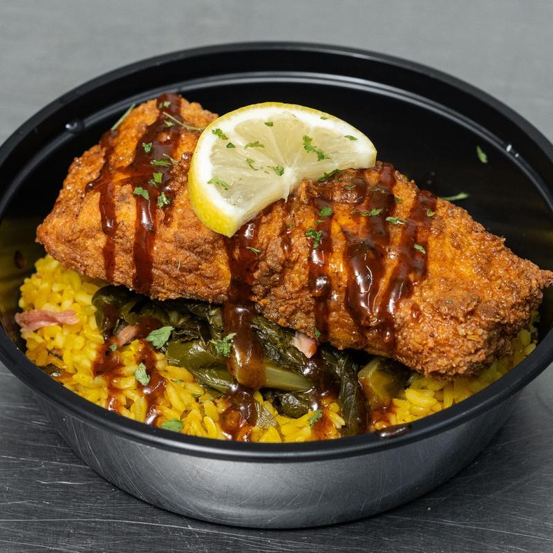 A perfectly seasoned fried salmon fillet served atop fragrant yellow rice, paired with tender collard green, and finished with a bold jerk drizzle.
