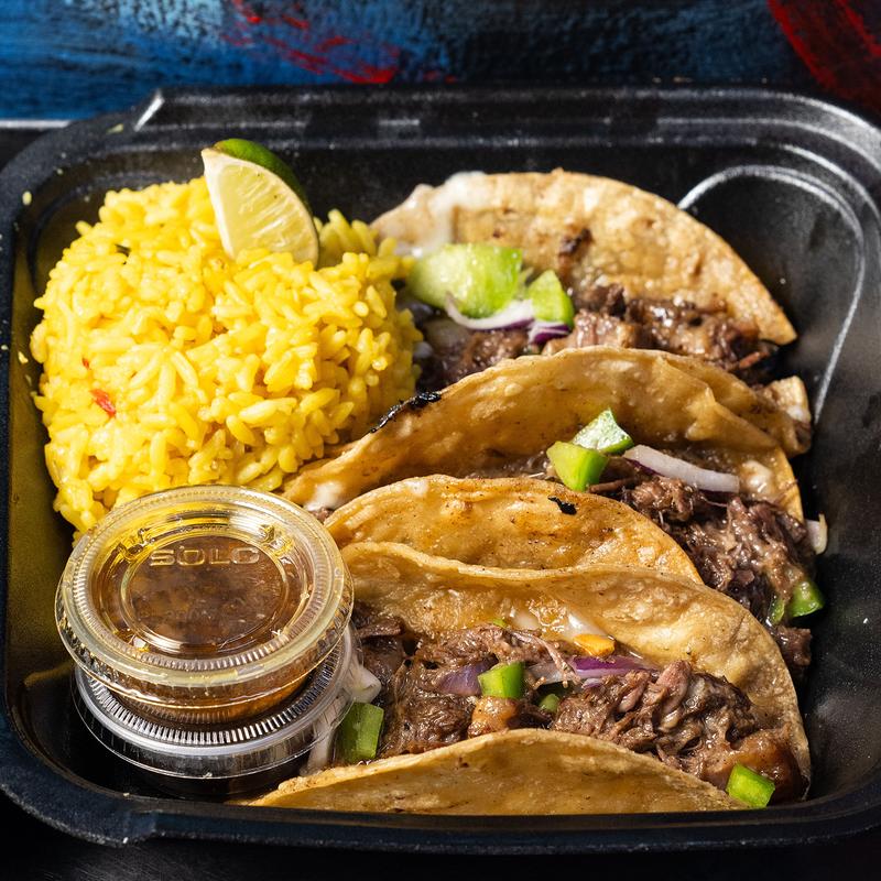 3 soft tacos filled with tender, slow-cooked oxtails, topped with cheddar cheese, fresh cabbage, and a hint of lime. Served with yellow rice.