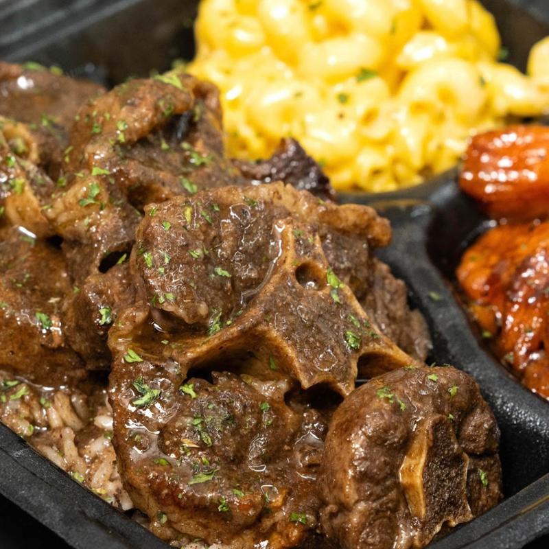 Tender, slow-cooked oxtails in a rich, savory sauce. Served with your choice of rice and 2 sides.